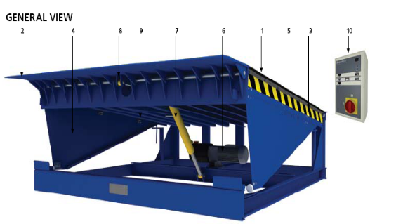 8、两个20吨的安全支撑脚装置,支持满车装卸时,车厢内没有活页搭板搭连位置情况下,调节板无须伸开活页搭板,叉车可直接驶上调节板装卸第一排货物;支持装卸作业时,货车意外驶离情况下,支撑脚支撑板面保持平台水平位置,减少叉车或操作人员摔下平台的危险。