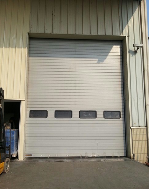 运行原理:以多关节活动的门片串联在一起,固定在导轨滑道内,以门上方卷轴为中心上下转动。